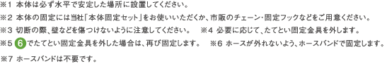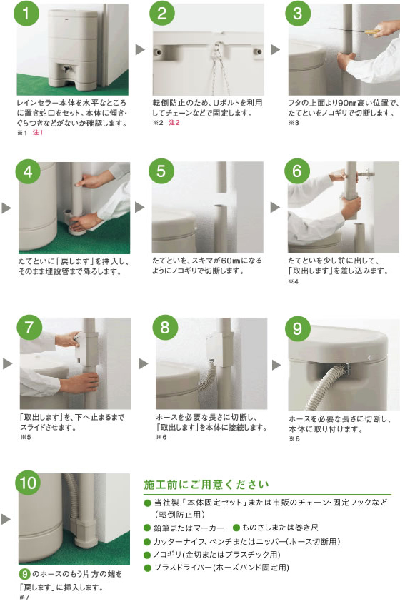 注2 雨ためま専科110の場合は、Uボルトの代わりに本体の溝とフック(左右2か所)を利用してチェーンなどで固定してください。
